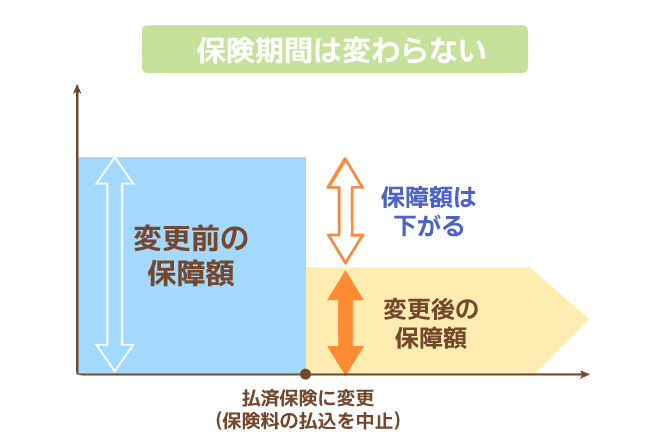 払済保険とは、保険料の支払いを中止し、変更時点での解約払戻金を一時払の保険料にして、保険期間を変えずに少ない保障額に変更できる制度です。