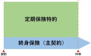 定期付き終身保険の「全期型」は、更新がなく保険料の払込期間中は定期保険の特約部分(保障)が続きます。