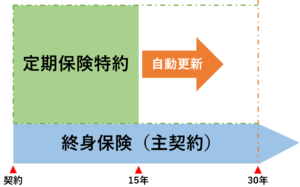 定期付き終身保険の更新型は、主契約の終身保険は一生涯保障が続き、特約として付加した保障は一定期間に区切って更新していきます。