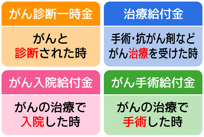 がんと診断されたり入院・手術が必要になった際や、がんを原因とする死亡時に給付金が支払われます。