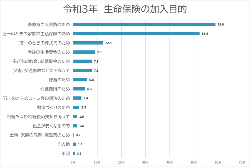 生命保険文化センターの調査によると、生命保険に加入する主な目的は以下の通り。※2
