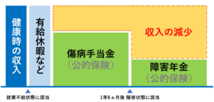 会社員や公務員は、就業不能状態になっても傷病手当金や障害厚生年金などの公的保障制度である程度減少した収入を補えます。