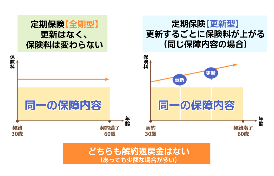 更新型」とも呼ばれ、満期を迎えると自動更新で保障が継続されます。更新すると年齢に応じて保険料が高くなるのが特徴です。