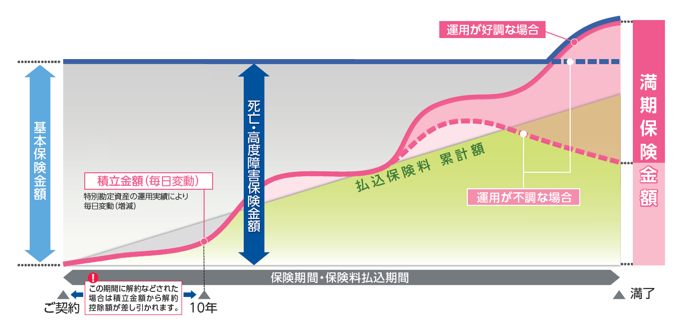 - この保険は積立金額、払いもどし金額および満期保険金額などが特別勘定資産の運用実績に応じて変動(増減)するしくみの変額保険です。